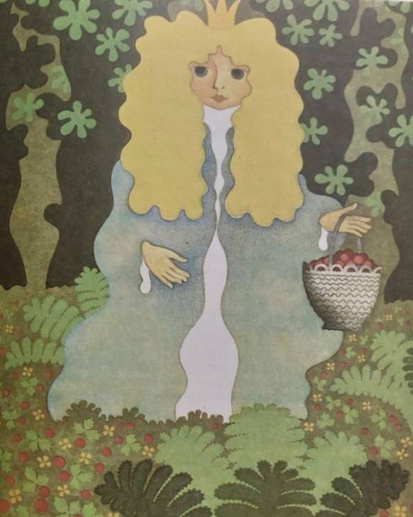 Но как только Сийм открыл глаза, он перестал слышать Кукушку. Там, откуда только что доносился ее голос, он увидел Королеву. На ней была золотая корона и голубая мантия, и она собирала красную спелую землянику в серебряную корзиночку.