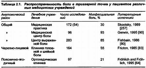 Сообщений о частоте встречаемости миофасциальных триггерных точек среди общей популяции больных достаточно много, и, суммированные и проанализированные, они свидетельствуют о высокой распространенности лиц, предъявляющих жалобы на региональную боль. Данные этих сообщений представлены в табл. 2.1.