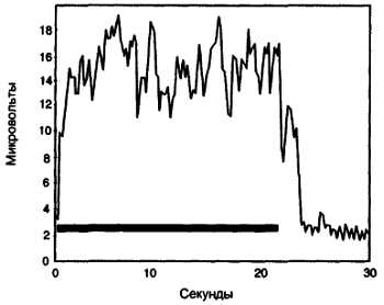 Рис. 2.4. Двигательная активность верхней части трапециевидной мышцы в ответ на болезненное надавливание на триггерную точку, расположенную в длинной головке трехглавой мышцы плеча. Черная планка изображает период болезненного надавливания на триггерную точку трехглавой мышцы плеча. Заметное увеличение поверхностной электромиографической активности (отраженный спазм) соответствует периоду механической стимуляции миофасциальной триггерной точки.