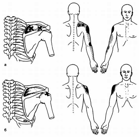 Другие авторы характеризуют боль, отраженную из надостной мышцы как направленную в сторону или внутрь плечевого сустава [6, 26, 27, 30] и по наружной поверхности верхней конечности [6, 25, 26], от лопатки до средней трети плечевой кости [28].