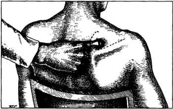 Рис. 21.3. Пальцевое надавливание на внутреннюю триггерно-точечную область надостной мышцы. Достаточно сильное надавливание на триггерную точку вызывает боль, распознаваемую пациентом.