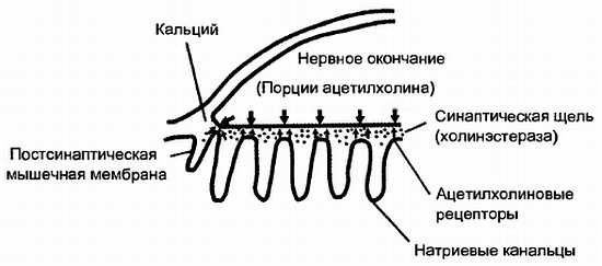 Нейромышечное соединение является синапсом, который, подобно многим другим структурам в центральной нервной системе, зависит от ацетилхолина в качестве нейротрансмиттера (передатчика). Основная структура и функция нейромышечного соединения схематично представлены на рис. 2.13. Нервное окончание продуцирует ацетилхолин.