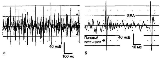 Спонтанная электрическая активность. Чтобы реально выявить спонтанную электрическую активность (SEA) миофасциальных триггерных точек с помощью электромиографии, необходимо использовать относительно высокое усиление потенциалов (20 мкВ на 1 деление) и скорость (10 мс на 1 деление). Если исследование с помощью иглы сопровождается ударной техникой, применяемой при электромиографии, исследующий вполне может не заметить активный локус или выявить локальную судорожную реакцию вместо собственно спонтанной электрической активности.