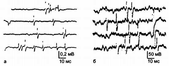 а, б – эти внутриклеточные записи были опубликованы в 1956 г. [171]; а – показано два нормальных (изолированных, однофазных и низкоамплитудных) потенциала с миниатюрной концевой пластинки; б – продолжительная серия наложения сверхвыраженных, шумоподобных высокоамплитудных аномальных потенциалов, вызываемых практически любым механическим нарушением зоны концевой пластинки.