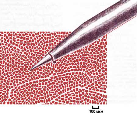 Рис. 2.16. Схематическое изображение, показывающее относительный размер открытого кончика стандартной, покрытой тефлоном электромиографической иглы, по сравнению с нормальными мышечными волокнами. Диаметр мышечного волокна составляет около 50 мкм. Обнаженный кончик иглы (без тефлонового покрытия) занимает пространство около 450 мкм и поэтому может находиться в контакте приблизительно с 18 мышечными волокнами (если считать с обеих сторон по фронту иглы).