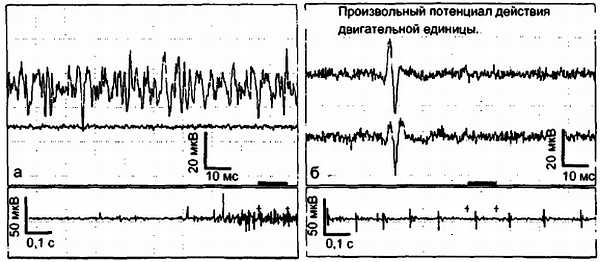 б – при четырехкратном усилении активности концевой пластинки запись показывает продолжительный шум концевой пластинки и случайные пиковые потенциалы.