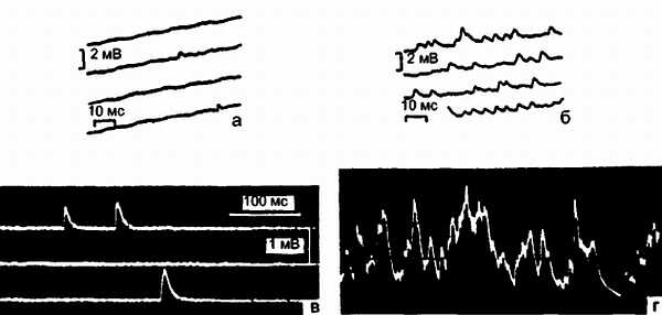 (Из Liley A. W. Аn investigation of spontaneous activity at the neuromuscular junction of the rat. J. Physiol. 132, 650–666, 1956, с разрешения; в, г – записи выполнены в 1974 г. при малой скорости и высоком усилении [137].)