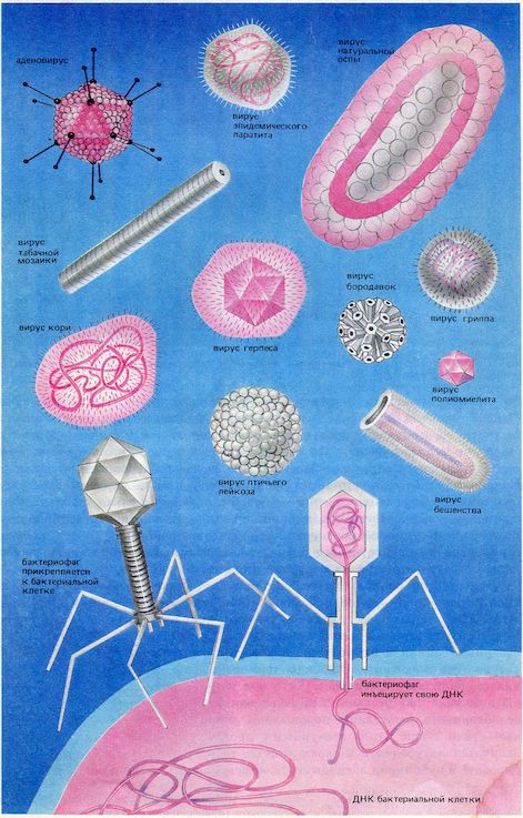 Вирусы – возбудители болезней человека, животных, растений (вирус табачной мозаики), а также вирусы, поражающие бактериальную клетку (внизу). Нападающие вирусы – бактериофаги – прикрепляются к поверхности клетки и инъецируют (вводят) в неё свой генетический материал. В ответ бактериальная клетка в соответствии с полученной от бактериофага генетической информацией «слепо» продуцирует из своего строительного «материала» сотни новых вирусных частиц. В результате этого клетка разрушается и высвобождает новых «убийц» бактерий.