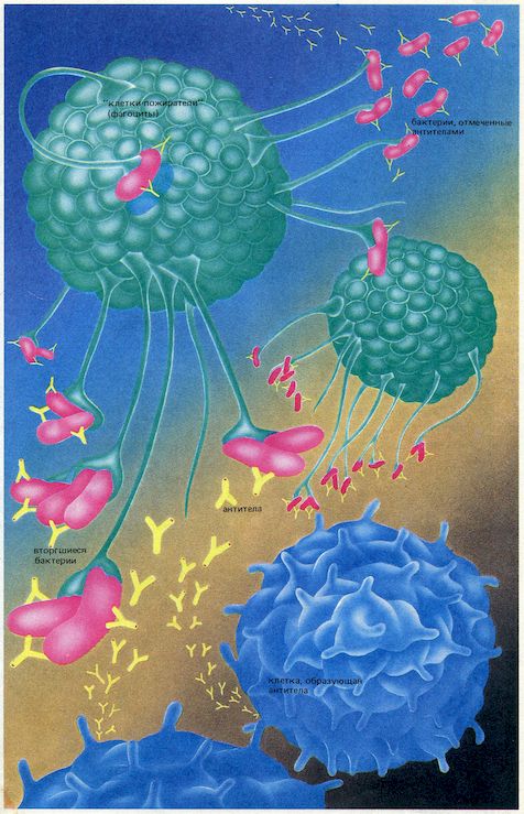 Как организм защищается от возбудителей болезней (бактерий)? Прежде всего внедрившиеся микробы распознаются иммунными клетками как «чужие». Иммунные клетки подают сигналы клеткам, синтезирующим антитела. Образующиеся антитела прикрепляются на поверхности бактерий и тем самым метят их в качестве будущих мишеней для «клеток-пожирателей» – фагоцитов, которые в конце концов поглощают и уничтожают эти отмеченные бактериальные клетки. В действительности защитная система организма имеет гораздо более сложное строение, пока ещё выясненное далеко не во всех деталях.
