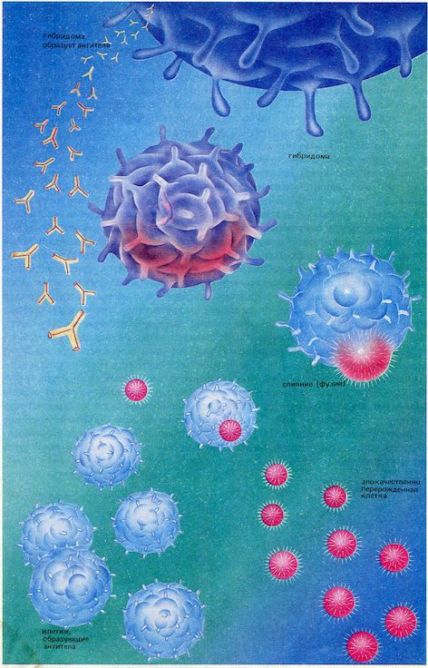 Всего лишь несколько лет тому назад был найден способ, позволяющий продуцировать антитела вне организма животного. Сначала была сделана попытка поддерживать в жизнеспособном состоянии в питательных растворах вне человеческого организма клетки, вырабатывающие антитела. Однако в скором времени эти чувствительные клетки погибали, деление у них протекало очень замедленно. И тут исследователи Цезарь Мильштейн и Георг Келер вдруг припомнили, что существуют клетки, легко и быстро размножающиеся не только в организме, но и в питательных растворах, а именно раковые клетки! Раковые клетки размножаются значительно быстрее, чем нормальные клетки, они прямо-таки буйно разрастаются. Было бы желательно передать это свойство, крайне опасное для организма, болеющего раком, клеткам, вырабатывающим антитела. Но как? И здесь был найден способ «слияния (фузии) клеток». Исследователи смешивали в пробирке раковые клетки и клетки, вырабатывающие антитела: осторожно, чтобы клетки не лопались, растворяли клеточные стенки, после чего оба вида клеток «сливались» (объединялись) друг с другом. В некоторых случаях две слившиеся клетки неожиданно образовывали новую, окружающую их общую клеточную стенку. Новообразованные комбинированные (гибридные) клетки проявляли удивительные свойства: они прекрасно размножались в питательном растворе – унаследованное качество раковой клетки – и при этом вырабатывали антитела определённого типа! По всей вероятности, в не таком уже далеком будущем этим методом удастся дёшево и в большом количестве нарабатывать антитела вне живых организмов. В настоящее время подобные лечебные средства предоставляются в распоряжение медицины новой специальной отраслью – иммунотехнологией.