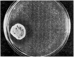Отчётливо видно, что рост бактериальных колоний на твёрдой питательной среде в чашке Петри подавлен вокруг колонии кистевидной плесени, поскольку последняя выделяет пенициллин; таким образом, в этой области возникла мёртвая зона.