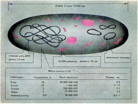 Клетка кишечной палочки (колибактерия, Escherichia coli) и некоторые количественные данные о ней. 1 нм = 0,001 мкм = 1 · 10 −6 мм.