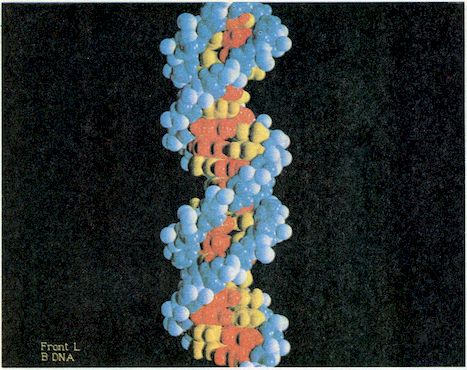 Молекула дезоксирибонуклеиновой кислоты (ДНК) – наследственного вещества – состоит из двух обвивающих друг друга одиночных цепей (нитей) (выделены голубым цветом), в которых с помощью определённой последовательности четырёх различных строительных «блоков» (обозначены красным и жёлтым цветом) закодирован «приказ» (инструкции) по построению белков из аминокислотных остатков. Определение пространственной структуры ДНК явилось результатом многолетних исследований с использованием современных рентгеноструктурных методов анализа, методов химического анализа, а также ЭВМ. Представленное здесь изображение было получено на ЭВМ, в которую была введена вся имеющаяся информация о расположении отдельных атомов.
