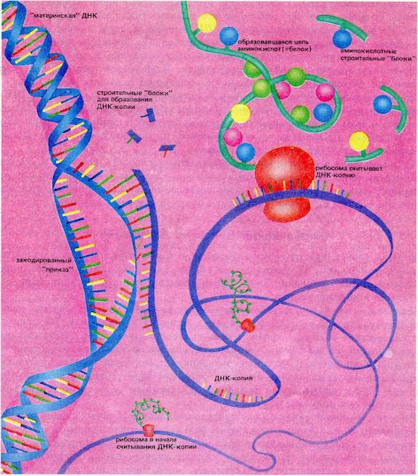 К готовой ДНК-копии молниеносно присоединяется несколько рибосом, они «нанизываются» на неё по всей длине и «считывают» приказ о сборке молекул аминокислот для построения амилазы. Рибосомы «слепо» повинуются и составляют предписанные цепи из аминокислот. При этом из рибосом – этих «машин» по производству белка – как бы выскальзывают связанные друг с другом аминокислоты. Работа идёт, аминокислотные цепи становятся всё длиннее, по мере того как рибосомы всё дальше «нанизываются» на ДНК-копию. Но вот рибосомы расшифровали ДНК-копии. Теперь: «Стоп! Белок готов!» Далее рибосомы отторгают выходящие из них длинные аминокислотные цепи. Последние тотчас же сворачиваются в клубки и образуют белки в форме шариков с выемкой на поверхности. Итак, белок амилаза построен и в качестве фермента может немедленно приступить к расщеплению крахмала на строительные «блоки» – молекулы сахаров. Тем временем вдоль ДНК-копии наслаиваются новые рибосомы, и таким образом образуется всё больше молекул амилазы. Если надобность в амилазе исчезает, специальные ферменты вновь разлагают ДНК-копии на составляющие их строительные блоки. После этого рибосомы уже не продуцируют белков.
