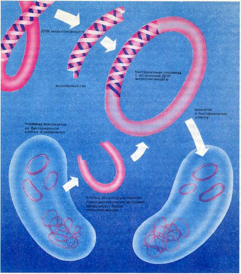 Что же лежит в основе генной инженерии? Из ДНК млекопитающего с помощью ферментов рестриктаз вырезают фрагмент, содержащий инструкцию для построения определённого белка (ген). Одновременно из бактерии извлекают малую кольцевую ДНК (плазмиду) и разрезают её при помощи тех же рестриктаз. Посредством клеющих (сшивающих) ферментов (лигаз) ДНК млекопитающего встраивается в бактериальную ДНК. Реконструированная плазмида вновь включается в бактериальную клетку. Там наряду с прежними инструкциями содержится и приказ бактериальной клетке синтезировать белок млекопитающего. Бактериальная клетка, претерпевшая генно-инженерные трансформации, «слепо» исполняет теперь новый приказ.