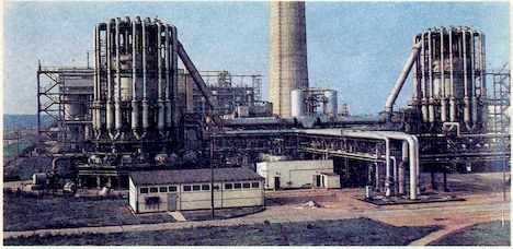 Завод по производству высококачественного кормового белка из компонентов нефти (алканов) в г. Шведте (ГДР). В двух гигантских биореакторах при участии дрожжей рода Candida ежегодно производится 50 000 т белкового концентрата фермозина. Попавшая в центр фотографии заводская труба относится к сушильной установке, поскольку продукция завода – кормовой белок – поставляется в сельское хозяйство в сухом гранулированном виде в форме небольших цилиндриков.