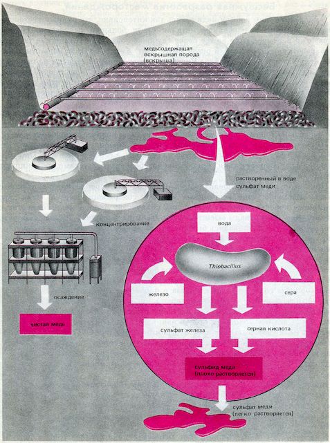 В последние годы добыча меди велась так интенсивно, что рудные месторождения с высоким содержанием металла стали большой редкостью. Горные разработки перемещаются во всё более глубокие зоны. Энергетические затраты на разработку месторождений резко возрастают. Уже в ⅩⅧ в. испанцы добывали медь в своих рудниках близ Риотинто в значительной степени из шахтной воды, содержащей медь. Вода уже выщелочила медную соль из горной породы. Однако всего лишь 25 лет тому назад ещё никто не знал, что в этом процессе принимают участие бактерии: они способствуют превращению труднорастворимой в воде «меди» в водорастворимую солевую форму.