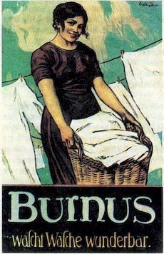 Первое моющее средство «Burnus» с биодобавками появилось в 1914 г. В качестве активных биодобавок использованы ферменты животного происхождения. Однако свое триумфальное шествие «биомоющие» средства начали лишь после того, как стало возможным получать биотехнологическим способом дешёвые и устойчивые в мыльном щелоке ферменты микробов. (На плакате надпись: «„Burnus“ чудесно стирает бельё».)