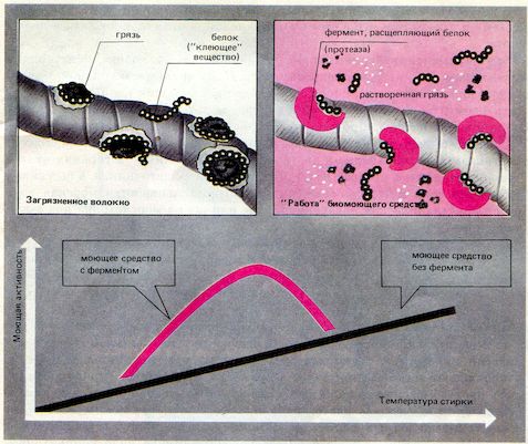 Принцип «работы» биомоющих средств (вверху). Сравнение эффективности обычных и «биологических» моющих средств (внизу).