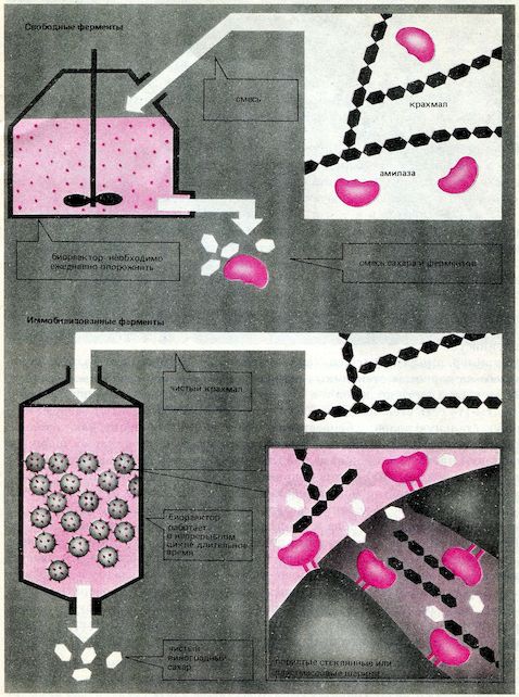 Например, ферменты могут быть иммобилизованы путём химического связывания со стеклом или полимером в случае использования стеклянных или пластмассовых шариков; иммобилизация ферментов может заключаться также в том, что ферментные молекулы включаются в поры полимерных материалов. «Бегство» молекул ферментов и в том и в другом случаях становится невозможным. Шарики или пористые частицы имеют такие размеры, что могут быть без труда с помощью фильтров грубой очистки вновь выделены из биореакторов. После недолгого отмывания их можно опять применить в новом процессе; более того, многие ферменты в результате иммобилизации становятся даже стабильней, так как, располагаясь в порах губчатых материалов, они обретают защиту от разрушения «прожорливыми» микробами.