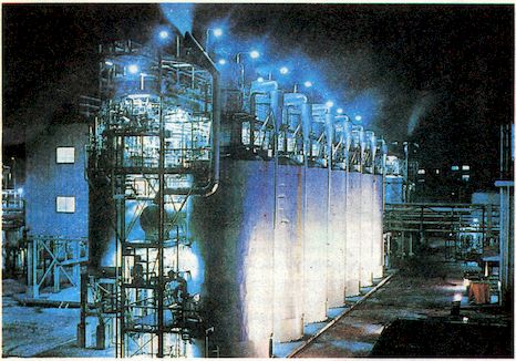 В таких гигантских биореакторах (высота 30 м, вместимость 240 м 3 ) фирма Киова Хакко (Хофу, Япония) выращивает микробов, которые при участии кислорода ежегодно вырабатывают 20 000 т глутамата – соли глутаминовой кислоты (вкусовая добавка к пищевым продуктам) – и 10 000 т аминокислоты лизина, используемой как кормовая добавка.
