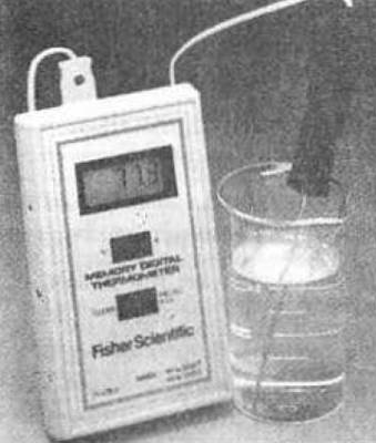 Рис. 2.19. Электронный термометр, показывающий, что температура жидкости в стакане равна +77,3 °C