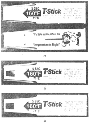 Рис. 2.21. Новая полоска (а), термочувствительный индикатор нагрет до начала плавления (вещество расплавилось не полностью) (б), новая полоска со снятым покрытием (в)