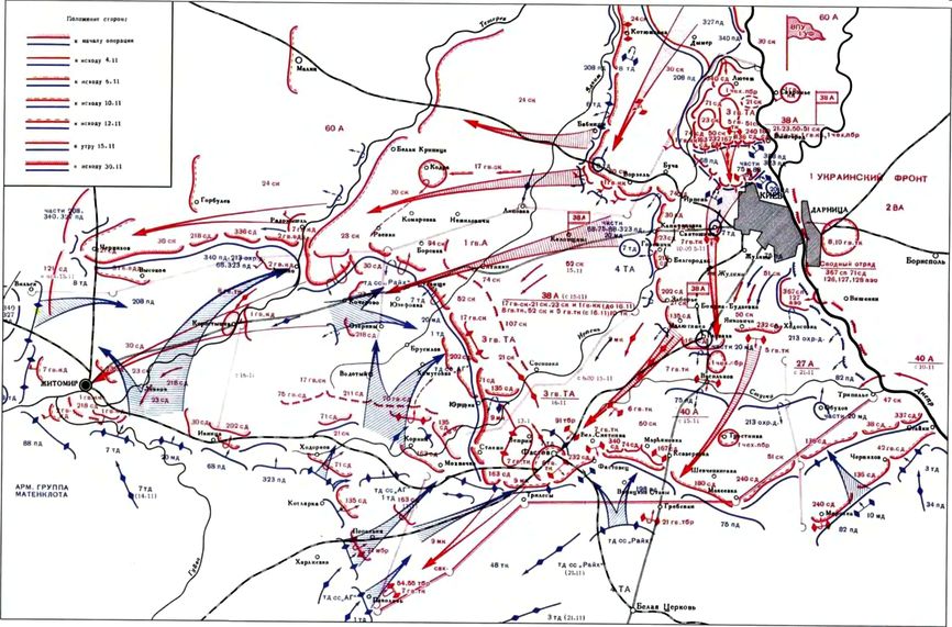 Путь главной ударной группировке врага вновь преградили 52, 17-й гвардейский и 21-й стрелковые корпуса 38-й армии. За ними 21 ноября начала развертываться фронтом на запад прибывшая из резерва Ставки 1-я гвардейская армия, в командование которой с 15 ноября вступил генерал-полковник А. А. Гречко. Два ее стрелковых корпуса – 74-й и 107-й – готовили оборону на рубеже Нежиловичи, Ситники, Козичанка, Сосновка, а третий, 94-й, был введен в первый эшелон на стыке между 60-й и 38-й армиями. Он и соединения 38-й армии получили задачу нанести удар из района Раевка, Боровка в южном направлении, во фланг группировке противника, нацеленной на Киев. В течение нескольких дней шли ожесточенные бои, которые, хотя и не изменили линии фронта (противник переходил во встречные атаки), но убедили германское командование, что оно на какой-либо успех на этом направлении рассчитывать больше не может.