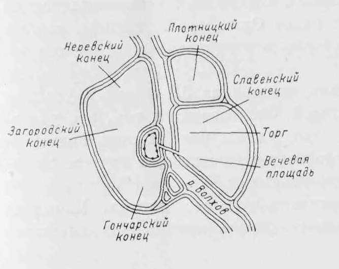 О планировке и застройке жилых районов той поры приходится судить главным образом по археологическим исследованиям, производившимся экспедицией Академии наук СССР во главе с профессорами А. В. Арциховским и В. Л. Яниным. В течение ряда лет был раскопан сравнительно большой участок Неревского конца. Археологи проследили на значительном протяжении Великую улицу – главную улицу Неревского конца (в районе ныпешней Дмитриевской улицы), которая вела от Владимирской проездной башни кремля к северу, в сторону Зверина монастыря, а также перпендикулярную ей Холопью улицу. В 1955 году был отрыт второй перекресток Великой улицы – на пересечении ее Кузьмодемьянской улицей.