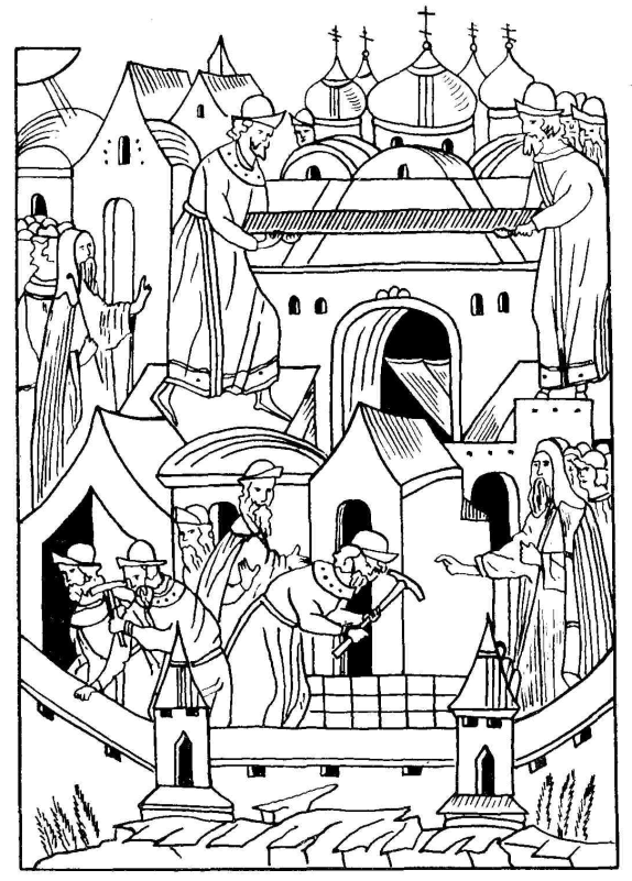 Строительные работы в Кремле (пропись с миниатюры Никоновской летописи XVI в.)