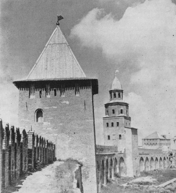 В то время усиливались оборонительные сооружения. Как уже упоминалось, велись попытки заменить деревянную ограду внешнего оборонительного пояса каменной стеной (см. стр. 27). На земляных валах Софийской и Торговой сторон в конце 80-х годов XIV века были поставлены стены «городнями» из деревянных срубов, плотно пригнанных и засыпанных землей и камнями. В 1391 году на участке стены, к которому выходили городские улицы, взамен деревянных были поставлены каменные башни. В летописи говорится: «В лето 6899 (1391 г. – И.К.)… и изставиша костры каменный, по обе стороны острога у всякой улици» [67, стр. 98].