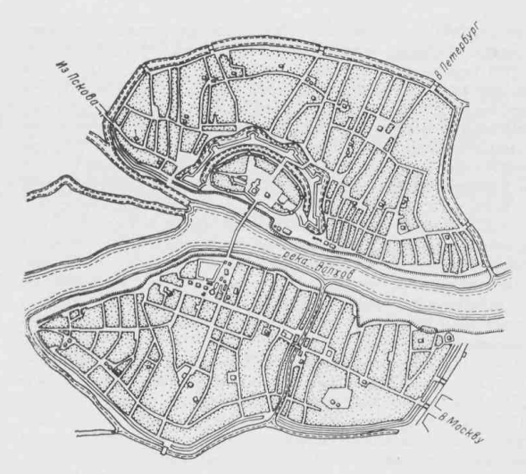 В конце XVI века в Новгороде происходил сложный процесс формирования «рядовой застройки», реконструкции стихийно сложившейся старой сети улиц. В планах города XVIII века кварталы в некоторых частях города показаны вытянутыми перпендикулярно береговой линии по направлению к внешним стенам. Некоторые из них, примыкающие к берегам Волхова, выделялись крупными размерами, выпадающими из общего характера и масштаба планировки, особенно в правобережной части [93, стр. 160]. Улицы вели к реке. Параллельно берегу Волхова через весь город проходила лишь одна магистраль. В некоторых районах города планировка приближалась к прямоугольно-прямо линейной.