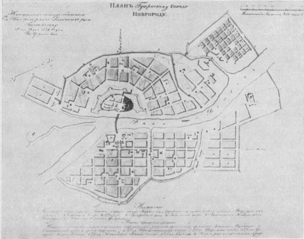В 1763 году вышел указ «О сделании всем городам, их строению и улицам специальных планов по каждой губернии особо» [77]. Работы по планировке, реконструкции и благоустройству городов были сосредоточены в «Комиссии каменного строения Санкт-Петербурга и Москвы». Эта комиссия разработала и генеральный план Новгорода. 16 июня 1778 года проект был утвержден.