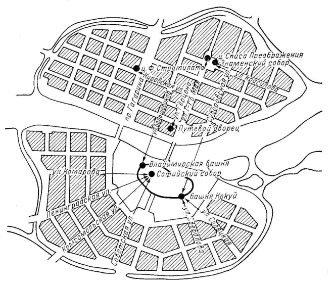 Полукольцевые улицы на Софийской стороне следуют контуру второго оборонительного пояса. Радиальные улицы сходились к кремлю и ориентировались на кремлевские башни. Композиционным центром Софийской стороны остался кремль, который получил доминирующее значение в архитектурно-планировочной структуре города.