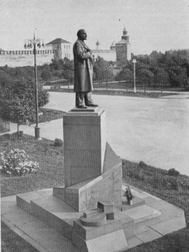В северо-восточной части площади в 1927 году был разбит небольшой сквер, в котором установлен памятник Владимиру Ильичу Ленину. В закрытом конкурсе на памятник лучшей была признана работа Московской скульптурно-литейной фабрики (авторы памятника архитектор Д. Осипов и скульптор М. Шильников) [31]. Владимир Ильич Ленин показан как вождь и творец социалистической революции. Бропзовая фигура Ильича – около пяти метров. Первоначальная статуя, выполненная по модели, выставленной на III съезде Советов, изображала Ленина без головного убора, с рукой, заложенной за борт пиджака.