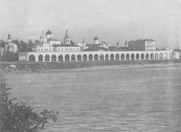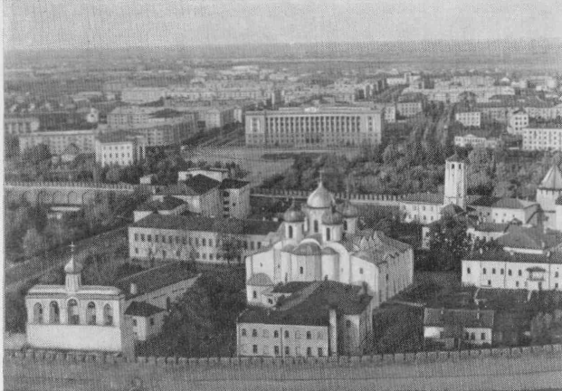 В формировании архитектурного облика Новгорода существенную роль играет застройка набережных. Неповторимо красив левый берег Волхова, на котором расположен кремлевский комплекс. Террасообраз-ная застройка правого берега, повышающегося в сторону проспекта В. И. Ленина, замыкается силуэтами памятников архитектуры.