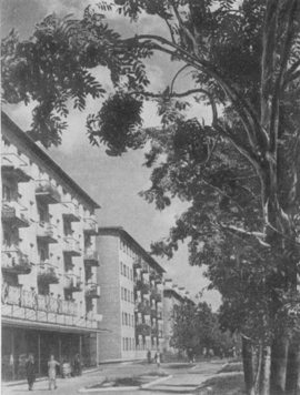 В 1967 году на Октябрьской улице была открыта новая средняя школа. Ее сооружение стало началом реконструкции Псковского жилого района [41], который был до этого частично застроен одноэтажными жилыми домами. В первую очередь начнет застраиваться часть территории между Псковской улицей и железной дорогой и от Инженерной улицы до новой магистрали. Общее количество населения в двух первоочередных микрорайонах, охваченных планировкой, составляет по проекту 12 тысяч жителей. Принятая средняя этажность зданий – 6,1. В основном здания пятиэтажные и лишь для архитектурных акцентов применены девятиэтажпые. Как правило, обслуживающие учреждения расположены также в первых этажах жилых домов.