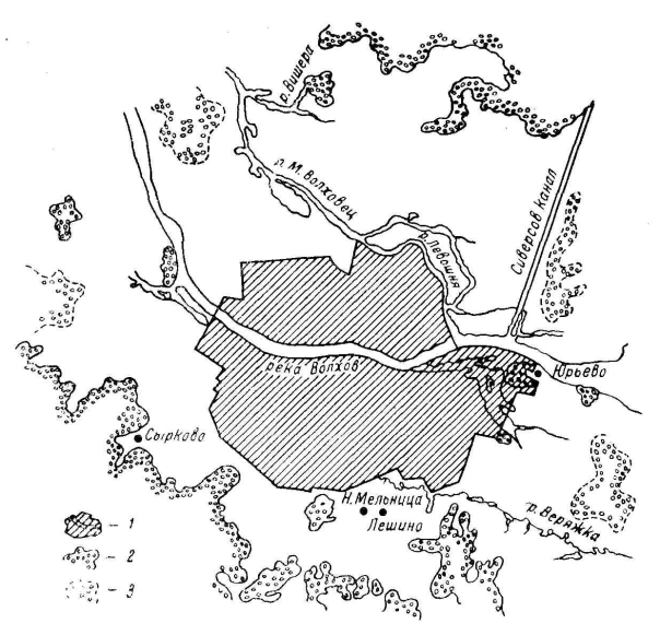 1 – территория города 2 – существующие лесные массивы; 3 – намечаемые лесопосадки