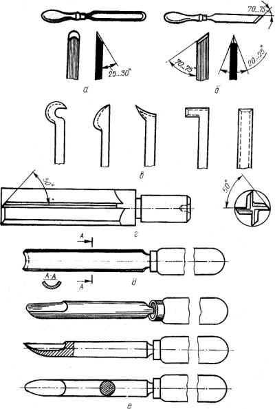 а – полукруглая стамеска (рейер), б – косяк (майсель), в – крючки, г – долбежные сверла, д – резец ложечного типа, е – резец в виде полукруглой стамески