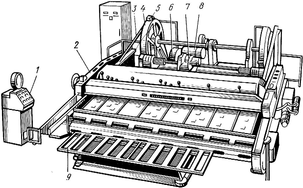 1 – пульт управления, 2 – суппорт, 3 – шатун, 4 – зубчатое колесо, 5 – прижимная траверса, 6 – клиноременная передача, 7 – редуктор, 8 – электродвигатель привода, 9 – стол