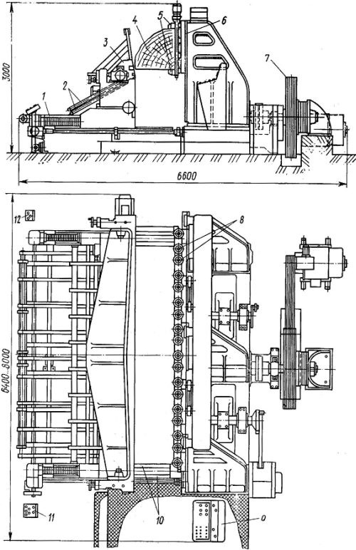 1, 2 – конвейеры, 3 – суппорт, 4 – брус, 5 – стол, 6 – направляющие стола, 7 – главный привод, 8 – устройство для закрепления заготовки, 9, 11 и 12 – пульты управления, 10 – направляющие суппорта