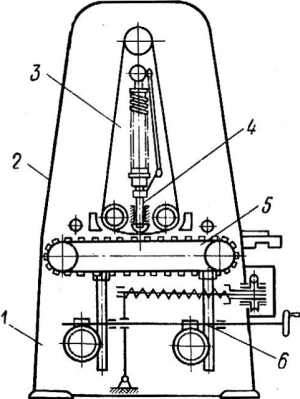 1 и 7 – направляющие для перемещения утюжка и стола, 2 – рычаг, 3 и 5 – шкивы, 6 – рукоятка, 8 – стол, 9 – утюжок, 10 – винтовой механизм