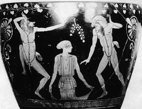 Вот Афродита между двумя сатирами (фрагмент росписи сосуда, около 460 года до н. э.):