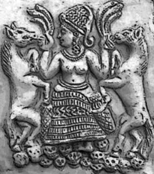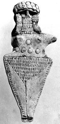 Здесь вы видите Мировое Древо с двумя птицами. Двойственность подчеркивается и другими парными элементами. Кроме того, отчетливо виден крест. Но и еще кое-что интересное: а именно треугольник. Этот треугольник посреди изображения – очень древняя штука. (И в гербе Великого Новгорода мы его тоже видели.) Это увеличенный, схематический лобок тех доисторических фигур, которые получили название «Великой Богини», – богинь плодородия каменного века. Вот их младшая родственница из Месопотамии (начало 2-го тысячелетия до нашей эры):
