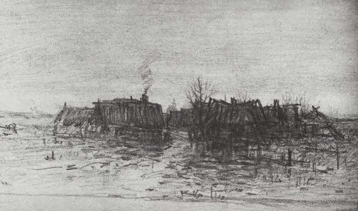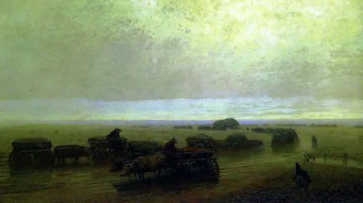 По наклонность к импрессионизму, к обобщенному трактованиюсказывается здесь уже очень решительно. Не отдельные повозки или фигуры чумаков, а весьобоз, общее движение этой темной живой ленты, извивающейся по широкой степи, занимает художника. Все детали тонут, подчиненные общему впечатлениюстепных ненастных сумерек…