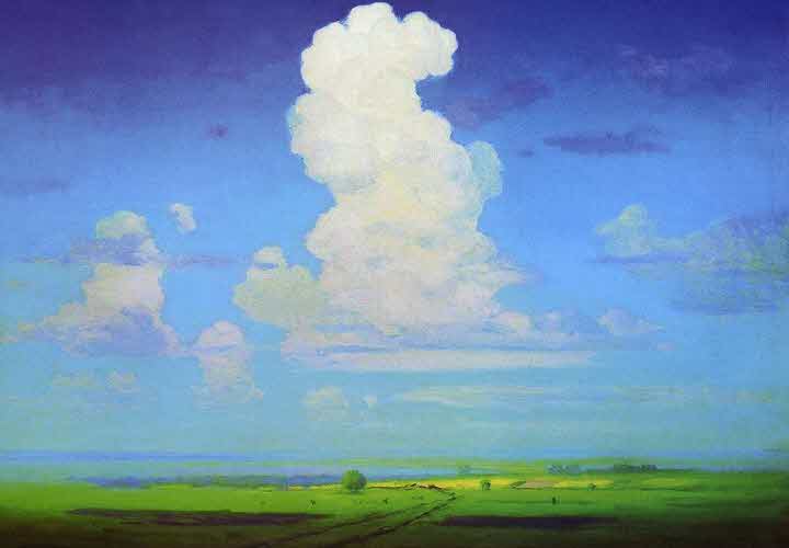 Если читатель припомнит сюжеты куинджиевских пейзажей, хранящихся в Третьяковской галерее, или хотя бы бегло проглядит приложенные здесь репродукции, ему бросится в глаза удивительная простота и незатейливость композиции, удивительная обыкновенностьсюжетов, на которых останавливался этот художник. И это совершенно одинаково относится как к первому истинно передвижническому, «серо-бурому» периоду, так и к тем годам, когда южанин эмансипируется от северных тонов, когда «блудный сын» возвращается к родной природе… Полное отсутствие «внешней красивости», полное отсутствие «хорошеньких» уголков или внешне грандиозных мотивов, грозно нависших скал, водопадов и т. п… У него всюду и всегда – только плоские степи, дороги, хатки на голых холмах да равнины, да небо…