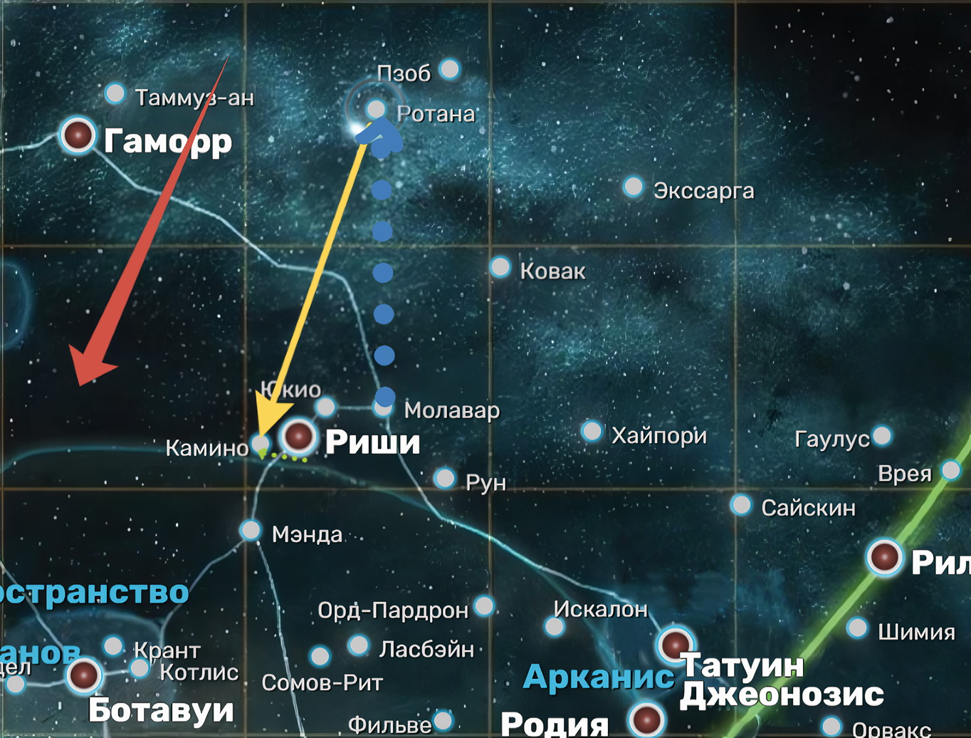 | Ахтунг! Пометки на картах ПРИБЛИЗИТЕЛЬНЫЕ, ибо не смог я найти их точное отображение в источниках, так что чукча рисует так, как прочитал. | Красная стрелочка – это направление к Галактическому Центру. | Синяя стрелочка – Ротанский маршрут, проходящий от Молавара к Ротане. | Желтая стрелочка – Линия Киберона, соединяющая Ротану через карликовую галактику Лабиринт Риши и Камино. | Зеленая стрелочка – это уже тот самый «простой» гипермаршрут, по которому Оби-Ван Кеноби добрался от Лабиринта Риши до Камино. |