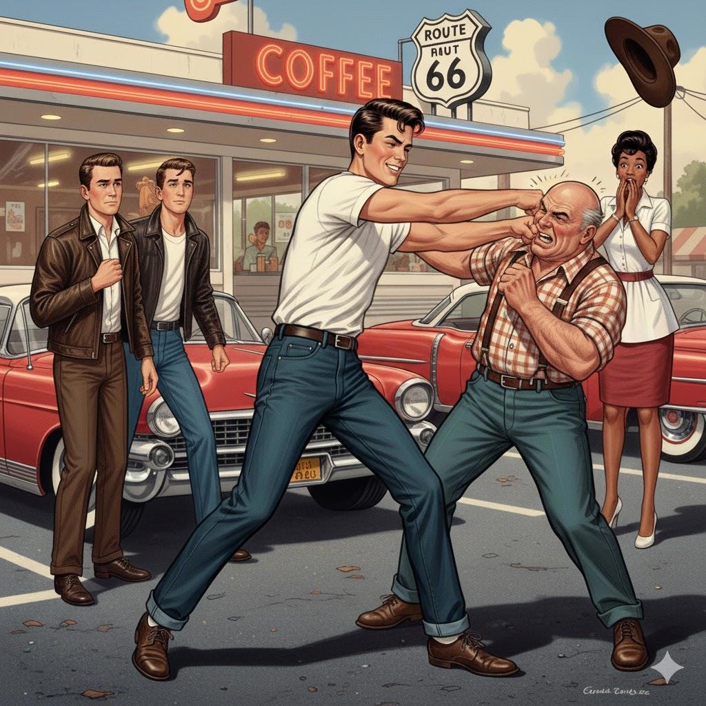 Лос-Анджелес пятидесятых из окна автомобиля выглядел удивительно просторным. Мы проезжали мимо невысоких зданий из белого бетона, мимо закусочных, над которыми возвышались гигантские фигуры хот-догов, и мимо бесконечных рядов пальм, чьи тени ложились на асфальт ровными черными полосами. Ларри вел машину уверенно, хотя тормоза «Плимута» издавали при каждом нажатии такой скрип, словно под капотом мучили кошку.