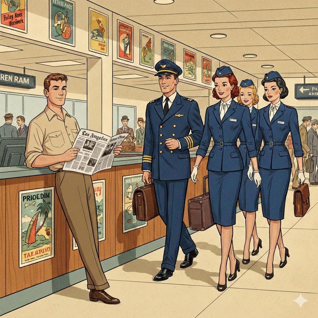 Я прислонился к колонне неподалеку от их стойки регистрации и превратился в слух и зрение. Мимо дефилировали пилоты в безупречных темно-синих мундирах с золотыми нашивками на рукавах. Они несли себя как боги, спустившиеся на грешную землю. Стюардессы в аккуратных пилотках и приталенных жакетах казались сошедшими с картин Pin-up.