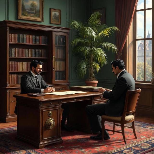 За это время я почти полностью впитал в себя знания и чувства Пети, поэтому вопроса, где расположен кабинет, не возникло. Когда я туда вошел, обнаружил, что отчим не один: на стуле вальяжно расположился незнакомый господин с дорогим кожаным портфелем на коленях. И остальное в его облике просто-таки кричало о хороших доходах: холеное лицо, костюм явно индивидуального пошива, начищенные до блеска ботинки дорогой кожи.